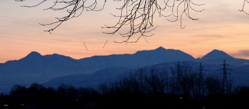 庭仕事の合間に見た今夕の妙高連山。左から妙高山、火打山、焼山。