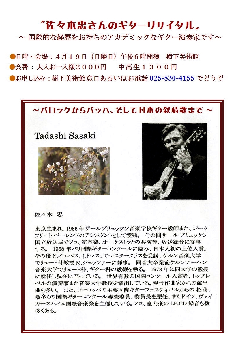 樹下美術館は山桜の頃、4月19日に佐々木忠(ささき ただし)さんのギター演奏会を開催致します。