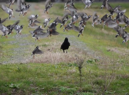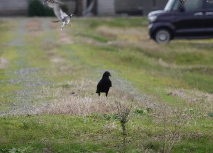 特に騒ぎにもならす、カラスはムクドリの食事をじっと見ています。