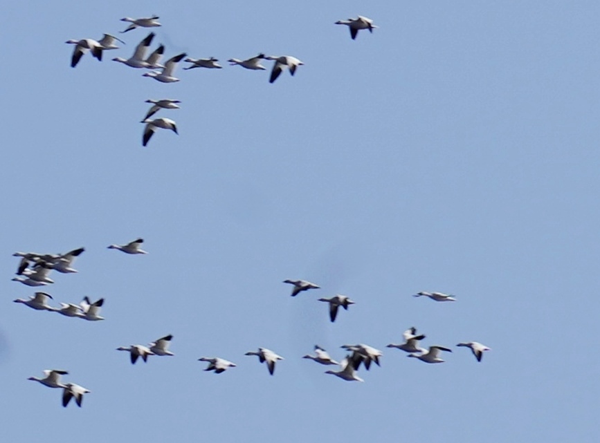 よく鳥を見る場所で白鳥とマガン、ヒシクイの小さな群がいた。雪の田を探し回るより、ここで待っていたらハクガンが来るかもしれないと考え、じっとしていた。