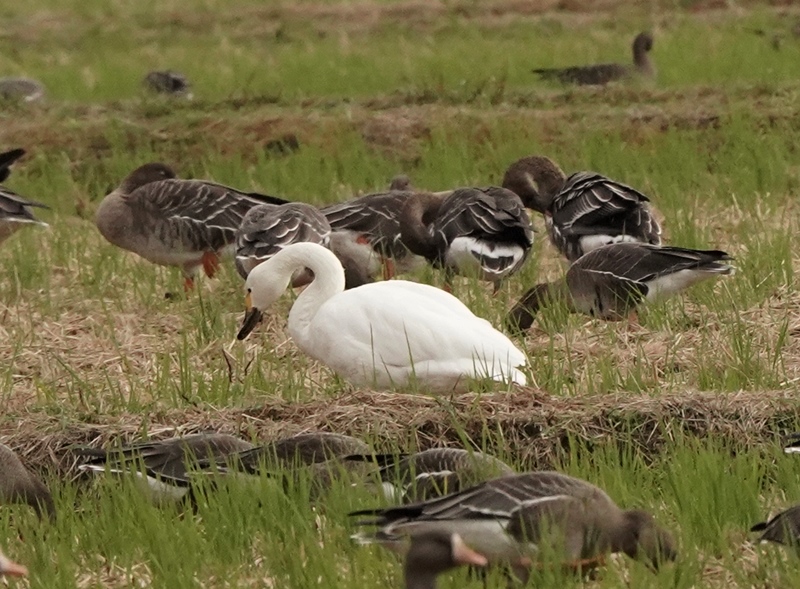 上掲写真には枯れた蓮の茎が沢山写っていますが、黒い塊の多くはカモや雁です。雁はマガンとヒシクイで,カモはマガモ、オナガガモほか沢山いるはずです。