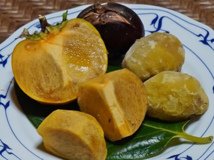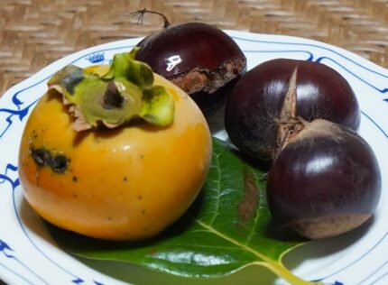 栗は非常に甘味がありよく熟れている。いっぽう柿は渋みが無いものの甘さはいまいち。もう少し待った方が良いかもしれない。