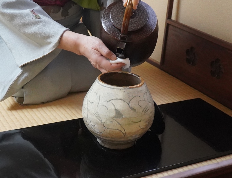 前回から二日経ってどんな花が生けてあるか、先回楽茶碗だったのを替えてみたい、利休の茶杓と水指の切り口を撮り忘れたので撮りたいなど、具体的な目的もあった。