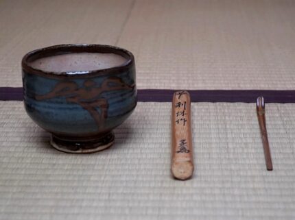 千利休の茶杓と筒。左は寛次郎の茶碗。