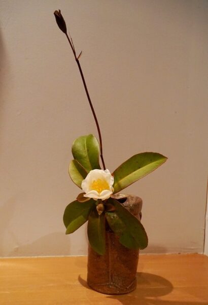 家に着くと、前日妻が興奮気味に話した唐椿(からづばき、とうづばき)が玄関に生かっていた。初めて目にする花は長くしっかりした葉を沢山まとい、実に存在感がある。
