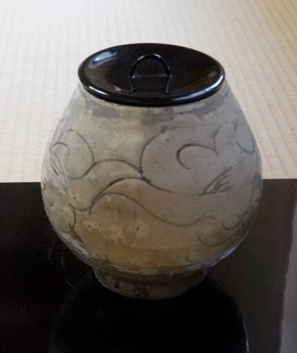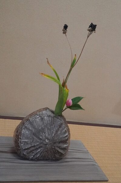 信楽焼き締め偏壺花入れ。