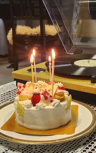 客人夫婦とも音楽に造詣深く、せっかくだからということで故中島幸子さん(小山作之助のひ孫さん)が残した四枚のモノラルLPアルバム「思い出のコンサート」に針を落とし、可愛いケーキに明かりを灯し、今月生まれの人達のために誕生祝いをしました。