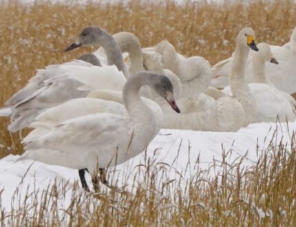 そして翌本日、夜半から早朝に降ったらしく、平地で数㎝の積雪があった。午後から小一時間近隣の水田を走ると小規模なコハクチョウの群を見た。