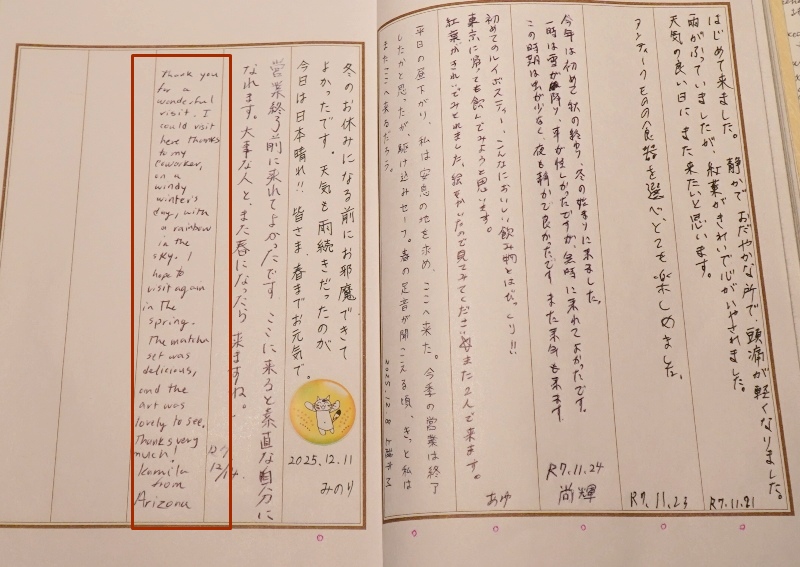 素敵な訪問ありがとうございました。虹が掛かる風強い冬の日、同僚のお陰で来ることが出来ました。春になったらまた来ます。抹茶セットは美味しく、展示は素敵でした。とても感謝しています、アリゾナからのK R7 12/14。