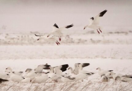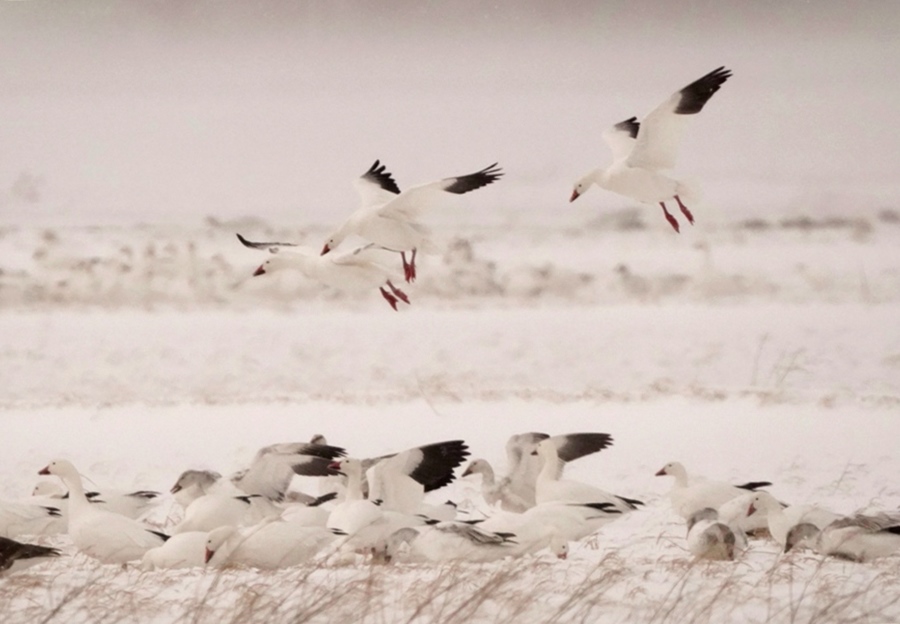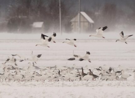 雪の状況はさほどでも無く午後3時を回る頃車を駆っていつもの場所へ探鳥に行った。目的地より1キロほど離れた場所にハクガンの一団が居た。