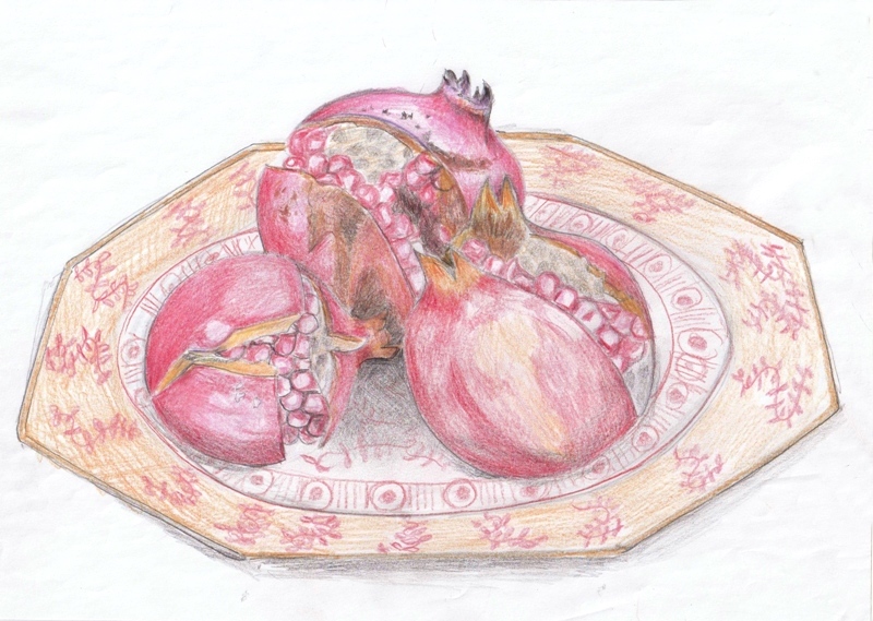 この度は鉛筆をそのまま塗ったが次回はザクロを右に移動させ、水あるいは唾で舐め舐め(一応non toxicとありました)色を伸ばして再度彩色を試みたい。