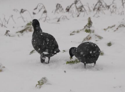 以前の大雪の時には切なくなり、避難し孤立している白鳥たちのそばに刻んだキャベツを撒きに行ったことがありました。言い訳程度の物でしたが、食べたものか確認していません。予報どおりなら鳥たちにとって今後の冬は相当厳しいものになりそうです。