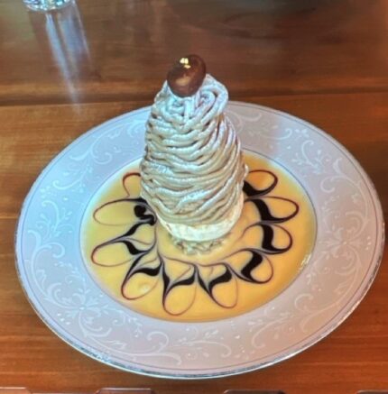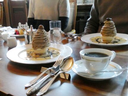 男性は大きなモンブラン、女性はガレット・デ・ロワでお茶。