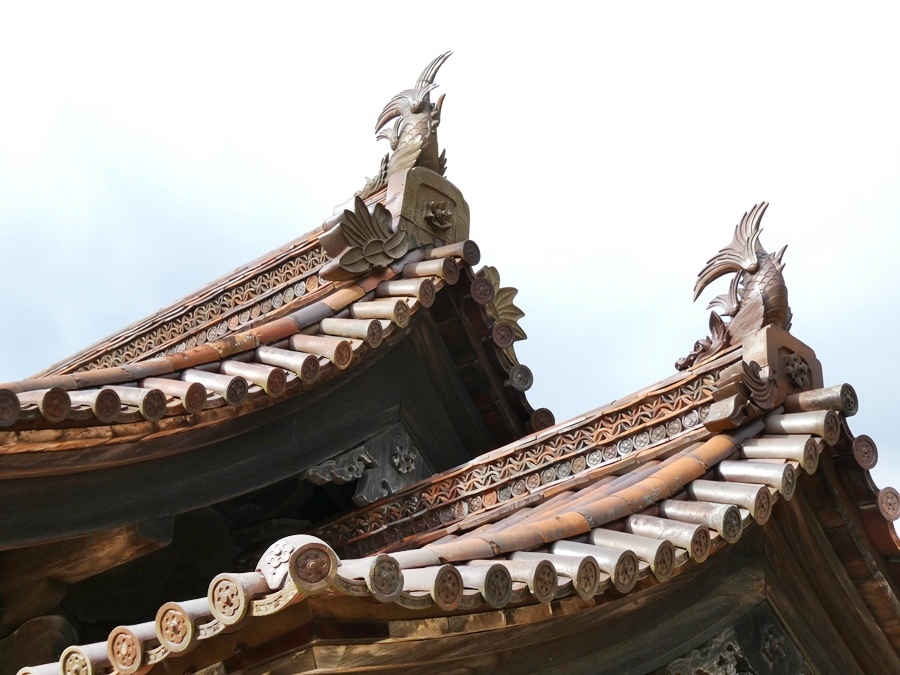 建物の膨大な瓦は全て備前焼で、耐性保持のため特に高温で焼成されたと言われます。長年にわたり大量の瓦を支える木造部分の強さにもほとほと感心させられます。建造物全ては今日も耐えるよう創意工夫され、維持した後世の人々にも感心です。