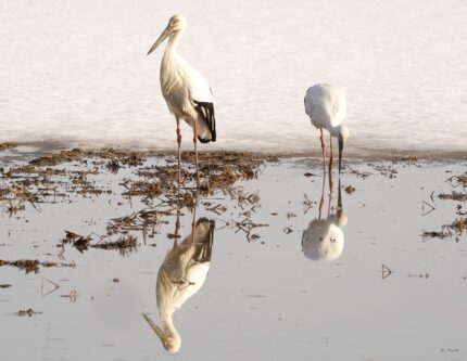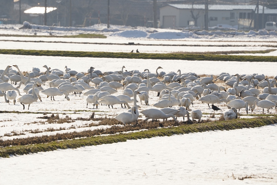 この二日で雪はさらに減り水面が顕れている田もあり、コハクチョウの群や二羽のコウノトリが突っついていた。