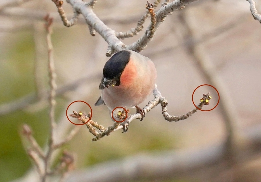 花芽を選ぶのだろうか(赤丸が食べられた芽)。