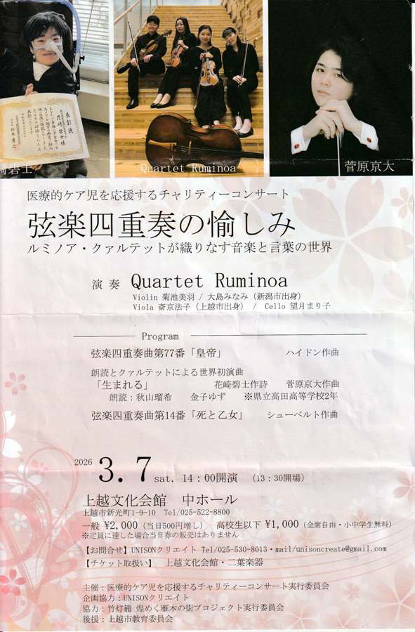 一昨日土曜日は午後2時から上越文化会館 中ホールで演奏会があり聴きに行った。「弦楽四重奏の愉しみ」は桐朋学園大学の学生音楽家グループ「[Qartet Ruminoa(カルテット ルミノア」の演奏で上越市の斎京法子さんがビオラで参加されていた。