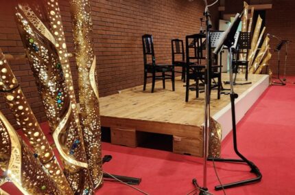 向こうとこちらに朗読用のマイクが見える。