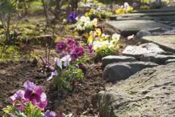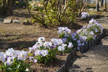 庭はこれまで茶花のために山野草をそれなりに意識してきましたが、昨年から明るさと見栄えも考えるようになりました。昨年はカフェの窓際にラベンダーを、今年はまずビオラから始めました