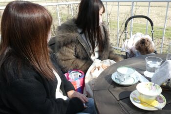 ワンこちゃんを連れた方がデッキで春風を楽しまれ、庭では数日暗くなるまで植えたビオラが日を浴びていました。