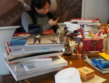 昨日樹下美術館の隣の草地でテント泊したスタンリーさん。本日昼、美術館へ行くとカフェの丸テーブル一杯に本を置き、熱心にメモしたり撮影していました。