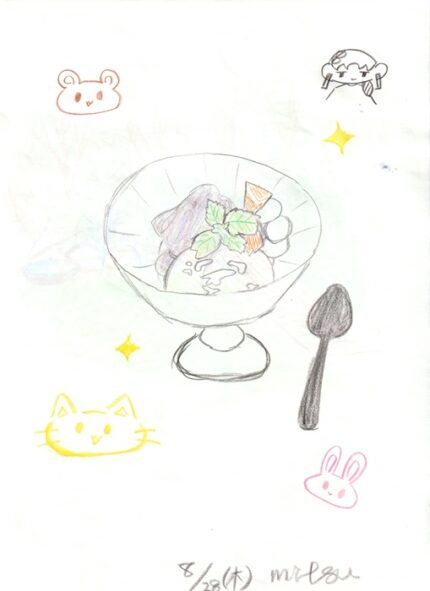 沢山描いて頂きました。展示をみてカフェでお茶を飲みケーキを食べゆっくりする。そんな時、何か描いてみたくなるのはよく分かります。私達は幸せになったり自分らしくなると「描く」のですね。「書く」もそうかも知れません。