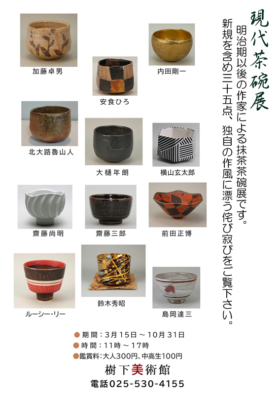 ●陶芸室では秋まで「樹下美術館の現代茶碗展」を、夏が過ぎましたら書と絵画「同級生二人展」と陶芸作品「今千春展」を開催予定です。